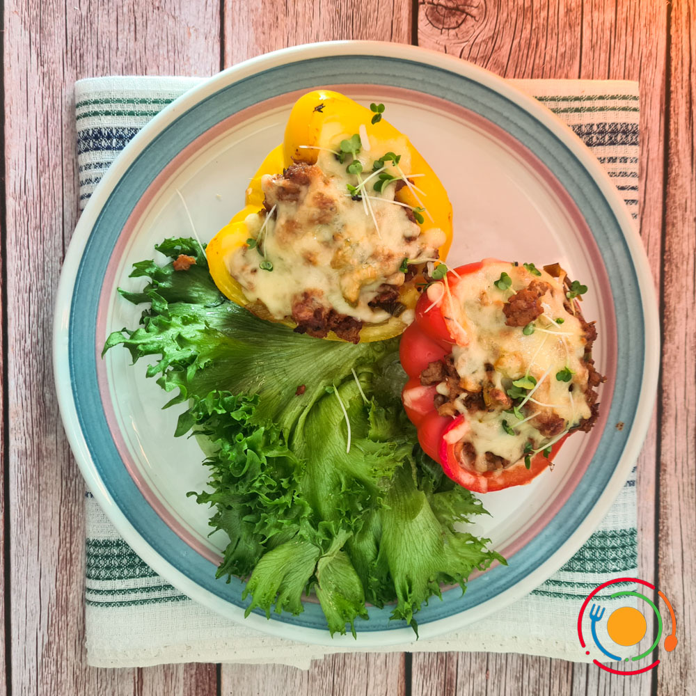 - Kepta mėsa užpildyti paprikų vidų ir uždėti sūrio.