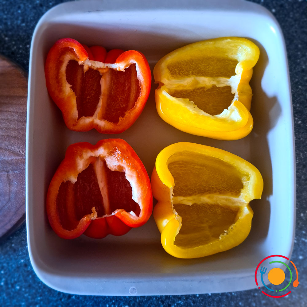 - Paprikas perpjauti per pusę ir gražiai išimti sėklas.