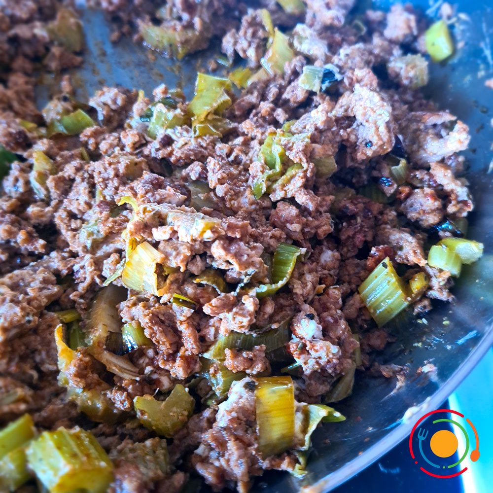 - Įkaitintame aliejuje pakepinti svogūną (ir česnaką, jei naudojama česnako skiltelė), kai svogūnas suminkštės sudėti maltą mėsą, česnako, paprikos miltelius, supjaustytą saliero stiebą. Kepti kol mėsa apkepa ir salieras suminkštėja.