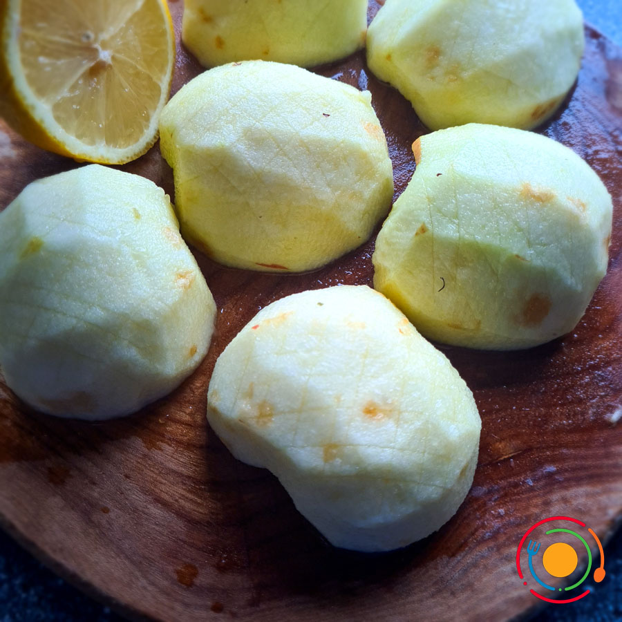 • Obuolius nulupti, perpjauti pusiau, išimti sėklas ir viršutinėje dalyje padaryti negilias įpjovas. Pašlakstyti citrinos sultimis, kad netamsėtų.