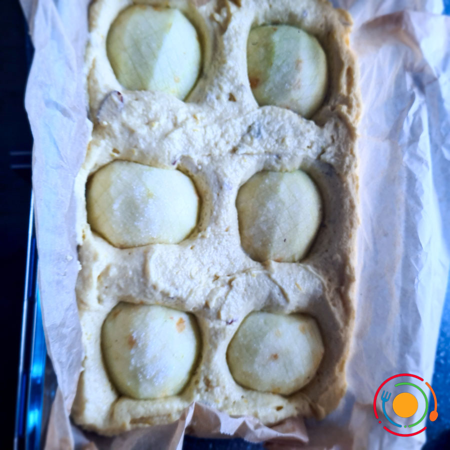 • Į skardą (maždaug 33x22 cm) supilti tešlą ir sudėlioti ant jos obuolių puseles.